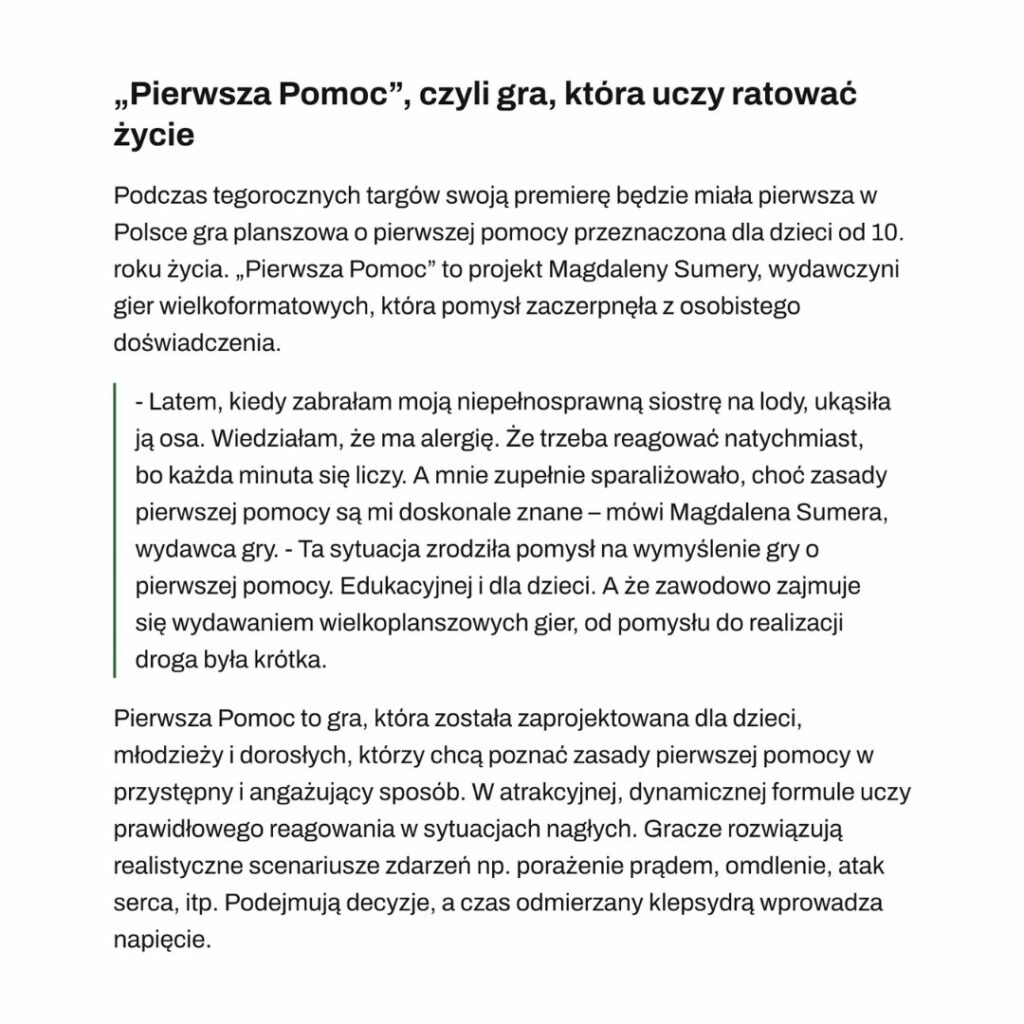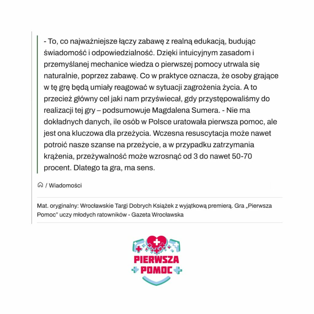 Dodatkowo o naszej grze informowała TVP Wrocław, podkreślając, że to pierwsza taka gra w Polsce, która uczy dzieci zasad udzielania pierwszej pomocy w praktyczny, przystępny i emocjonujący sposób.