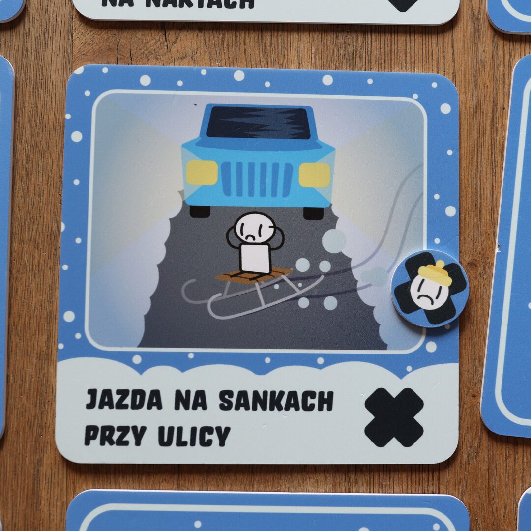 Gracze odnajdują pary kart przedstawiających właściwe zachowania, unikając kart z niebezpiecznymi sytuacjami. Gra rozwija pamięć, spostrzegawczość i wprowadza elementy ruchowe, takie jak przysiady czy pajacyki, czyniąc zabawę jeszcze bardziej angażującą. Idealna na ferie, zajęcia grupowe i edukacyjne w szkołach i przedszkolach!
